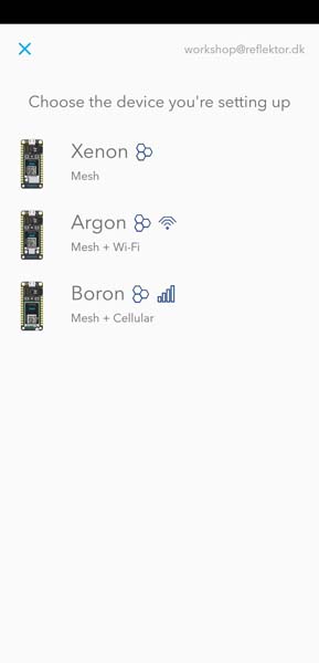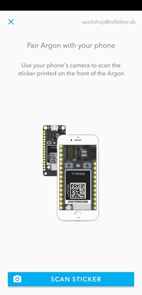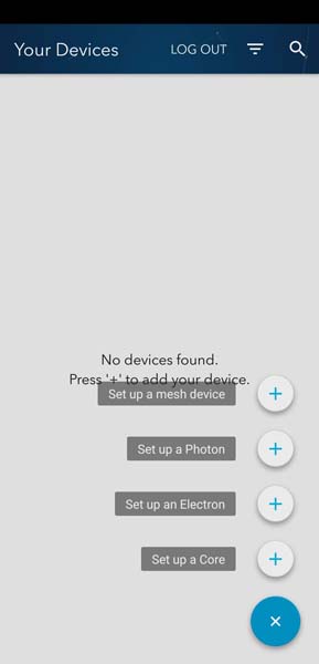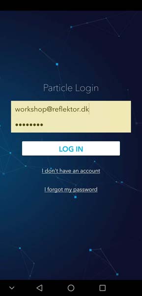 MODEbutton for three seconds, until the RGB LED begins blinking blue.Make sure your phone has Bluetooth turned on. Open the Particle Mobile App and login to your particle account, if you have not already.
