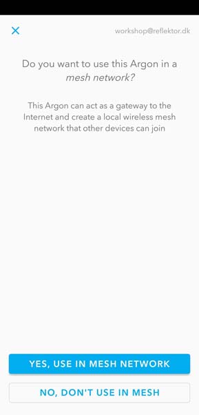 - After the update is complete the app will ask if you want to add the Argon to a mesh network. For now, select NO, DON'T USE IN MESH, as we will will explore the mesh networking capabilities later on.