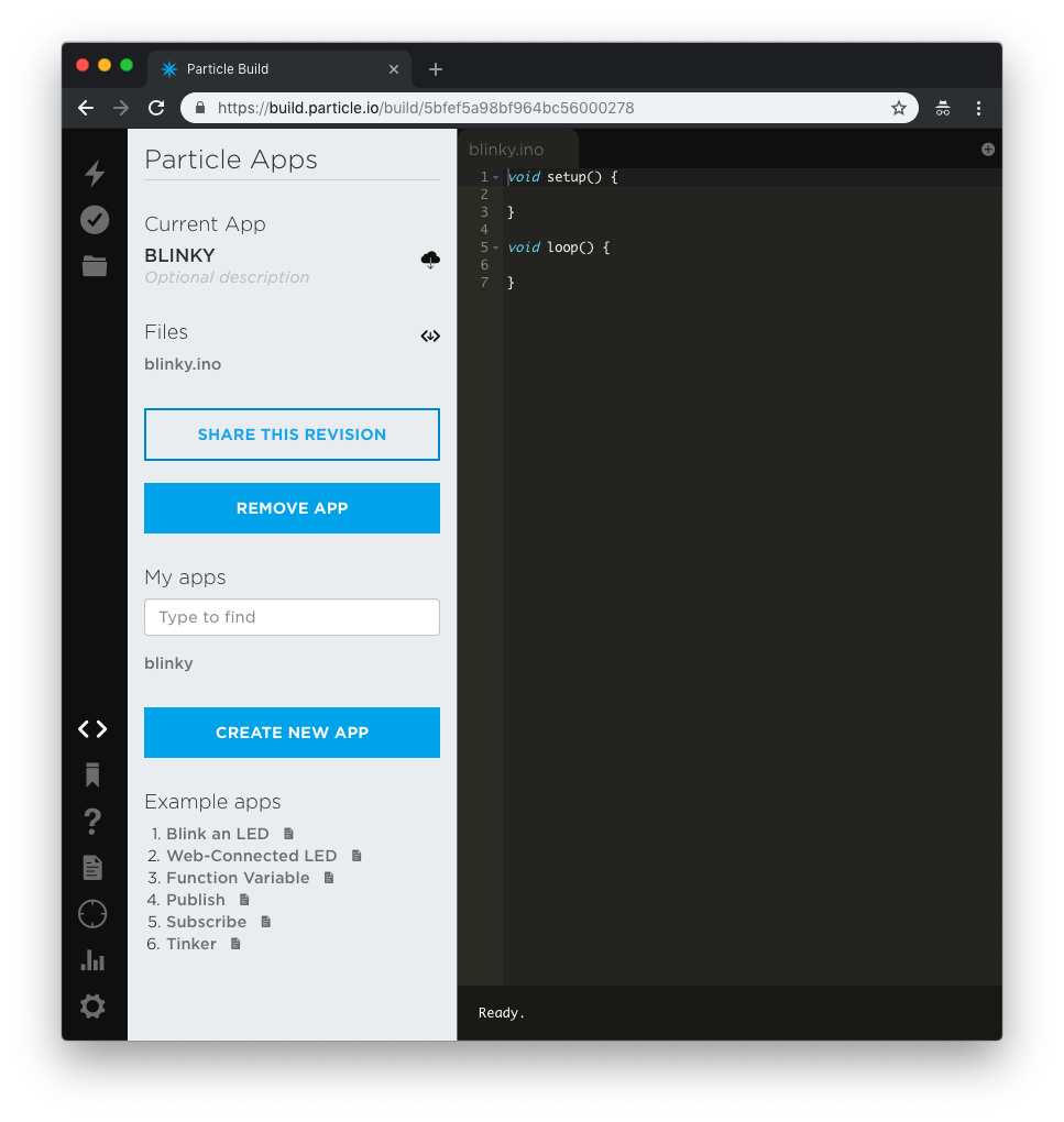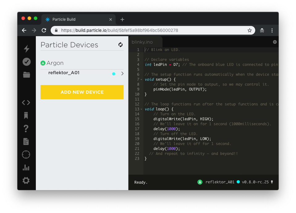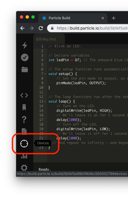 You will now flash code (hardware speak for sending code to a device) from the Particle Web IDE