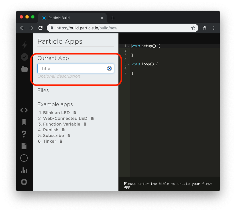 Create a new app by submitting a title (e.g. "blinky") and press enter.