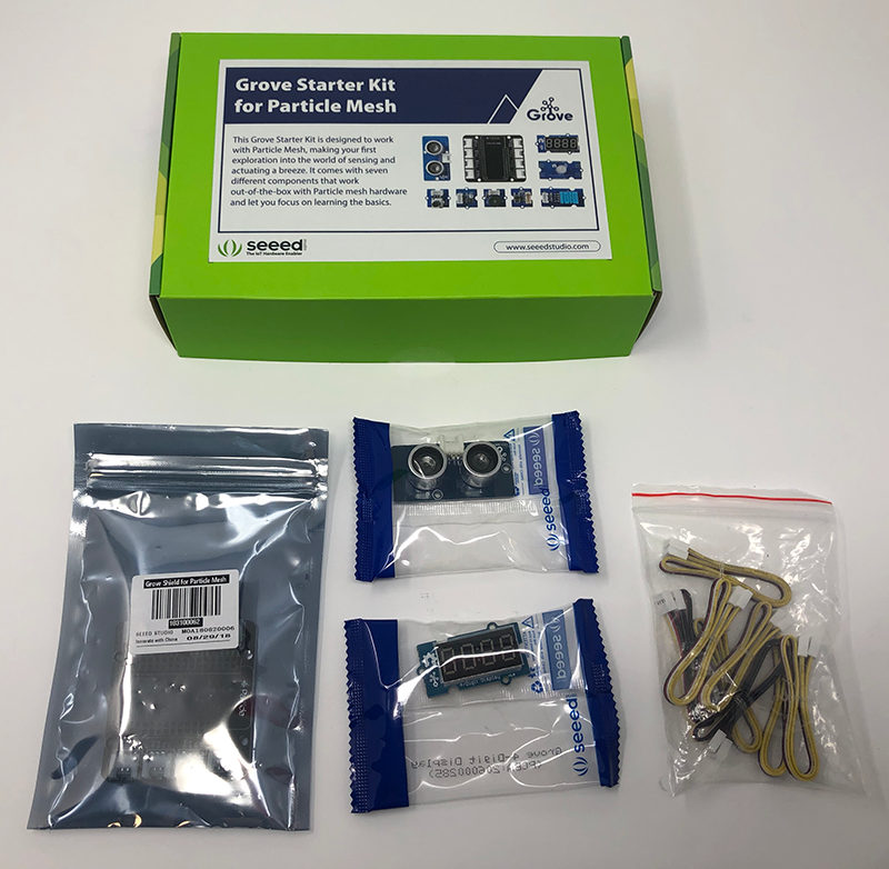 The Grove starter kit for Particle Mesh comes with seven different components that work out-of-the-box with Particle Mesh devices, and a Grove Shield that allows you to plug in your Feather-compatible Mesh devices for quick prototyping. The shield houses 8 Grove ports that support all types of Grove accessories. For more information about the kit, click here.