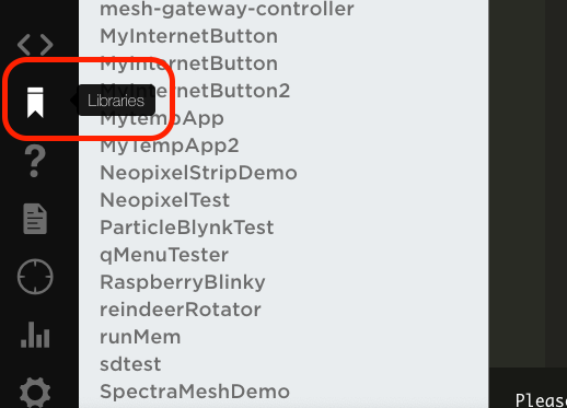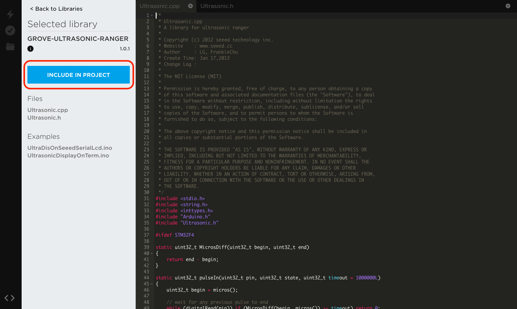 - To use the Ultrasonic Ranger, we'll need the help of a library, which you can include in your project by clicking on the libraries tab in the lower left side of the screen.